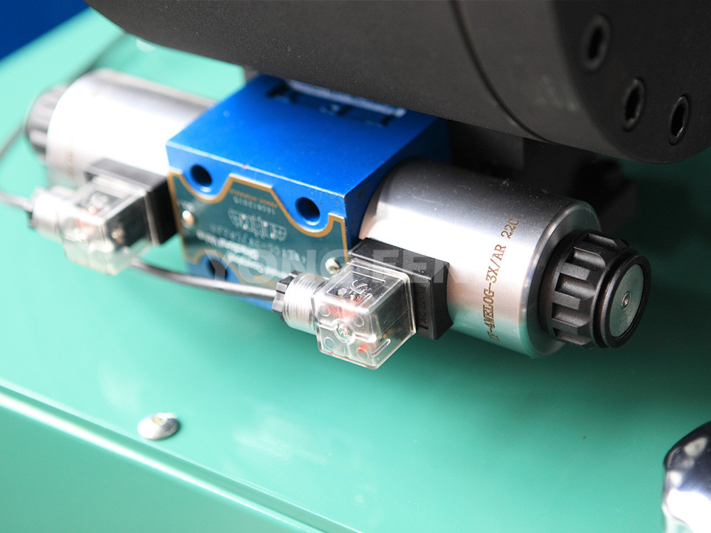 油泵安装于油箱内浸泡在液压油里达到科学散热静音的设计目的,油泵在电机驱动下,输出液压油,推动扣压油缸内的柱塞运动,致使模座径向收缩,实现模具对胶管接头外套的挤压。当收缩量达到千分尺预定值时,挤压自动停止,电磁换向阀换向后,油缸内的柱塞反向运动,模具随之张开,扣压胶管完成。