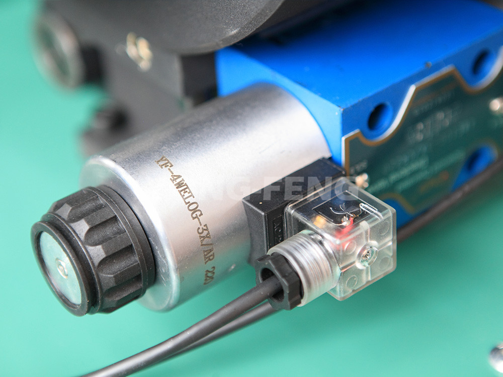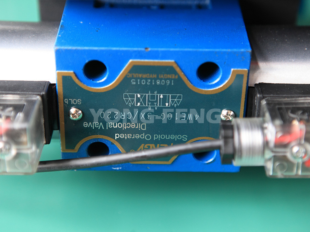2、液压系统由电 机、油泵、电磁阀、调压阀及液压阀组成了具有进退运动的双液压油路,而且在双液压油路中还增加离一个快速泄油阀油路,以达到更加快速 回位的目的,且速度可调、噪音和系统压力降低。
